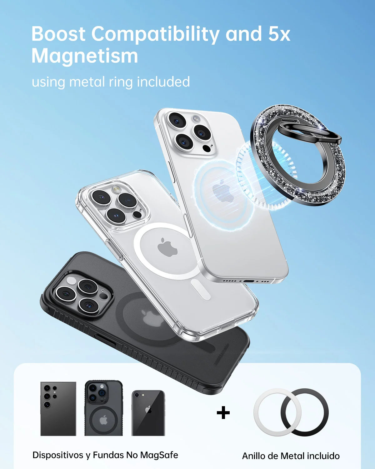 - Magnétique ultra-puissant : Le support magnétique pour téléphone Syncwire Glitter est fabriqué avec des aimants NdFeB N55, offrant une force magnétique exceptionnelle. Fixez votre téléphone en toute sécurité au support magnétique MagSafe d'un seul doigt et bénéficiez d'un maintien ferme qui résiste aux mouvements et aux secousses. La force magnétique est multipliée par 5 grâce à l'anneau métallique fourni.
